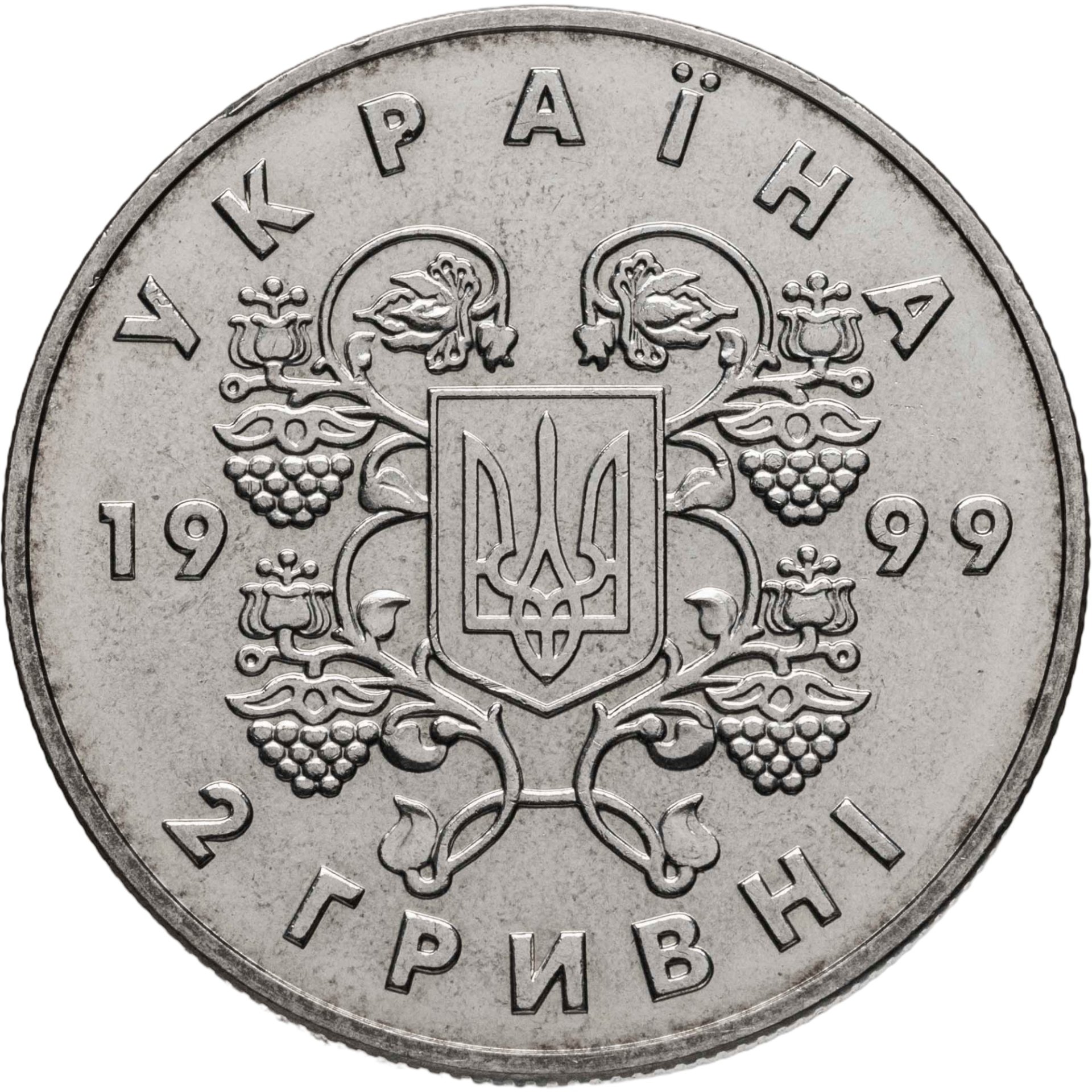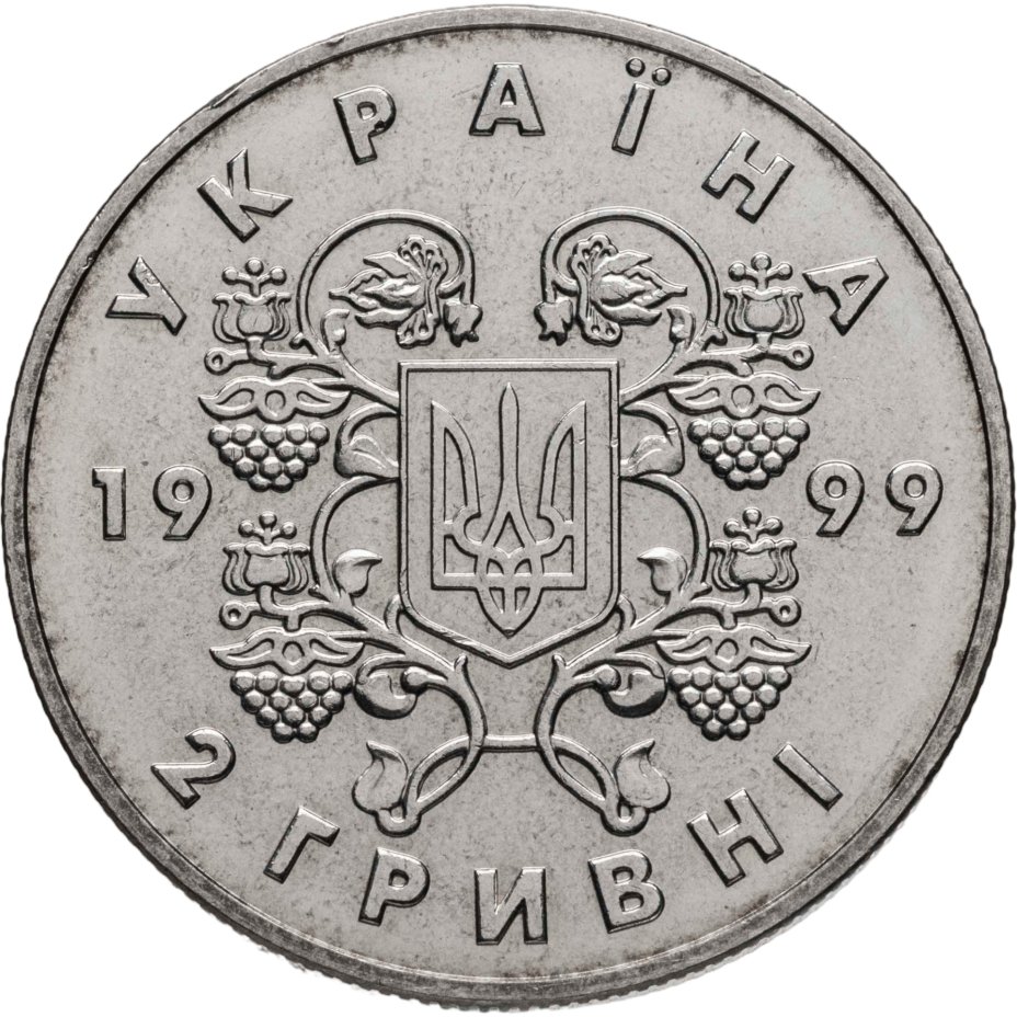 Малый Государственный Герб Украины, орнаментированный по мотивам народных настенных росписей и круговые надписи УКРАИНА, 2 гривны, 1999.