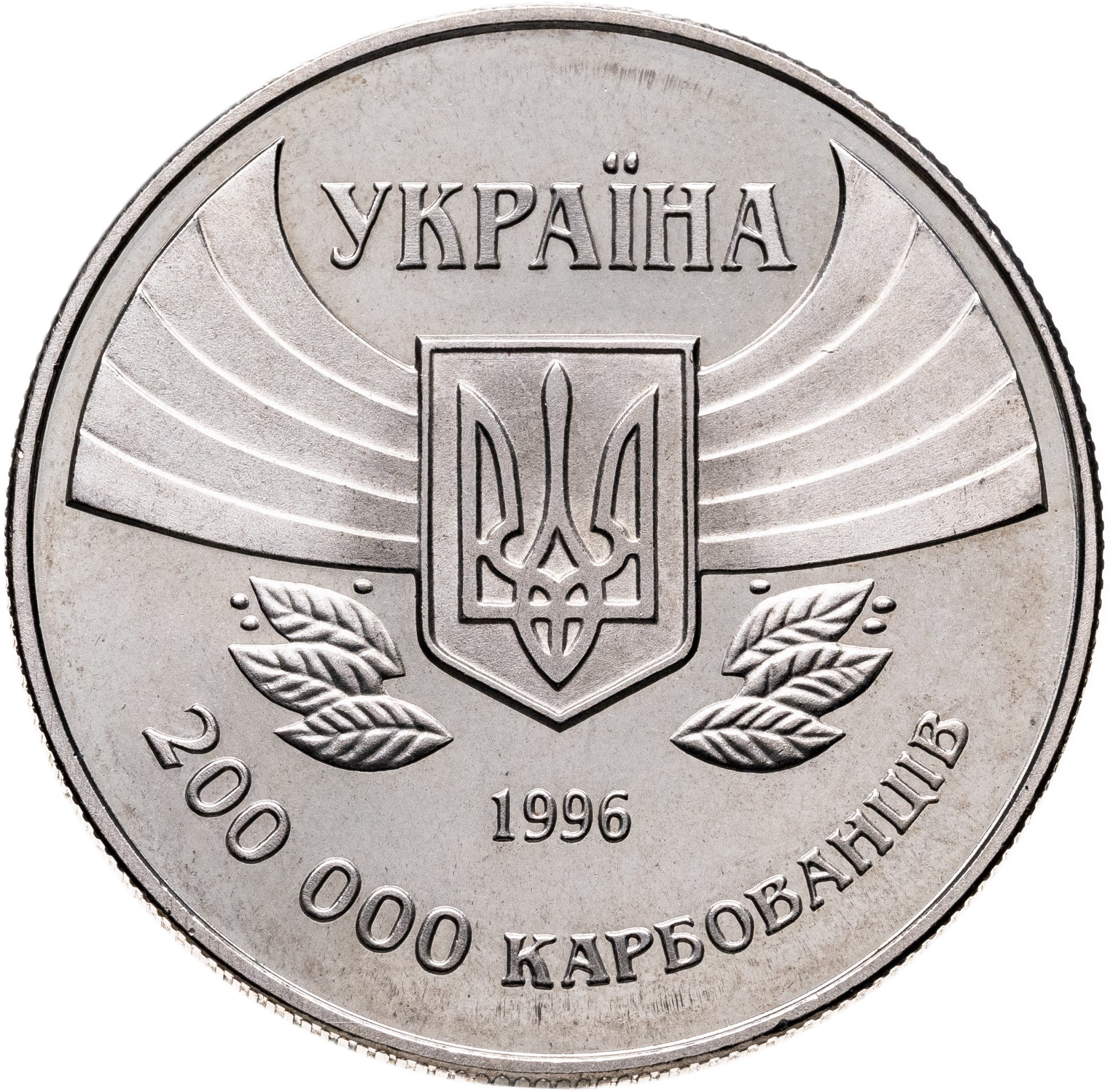 В центре находится изображение малого Государственного герба Украины, справа и слева от него - стилизованные изображения трибун стадиона и лавровых листьев. Над гербом надпись УКРАИНА, под гербом 1996 - год чеканки монеты. Внизу по кругу обозначение номинала: 200000 КАРБОВАНЦЕВ.