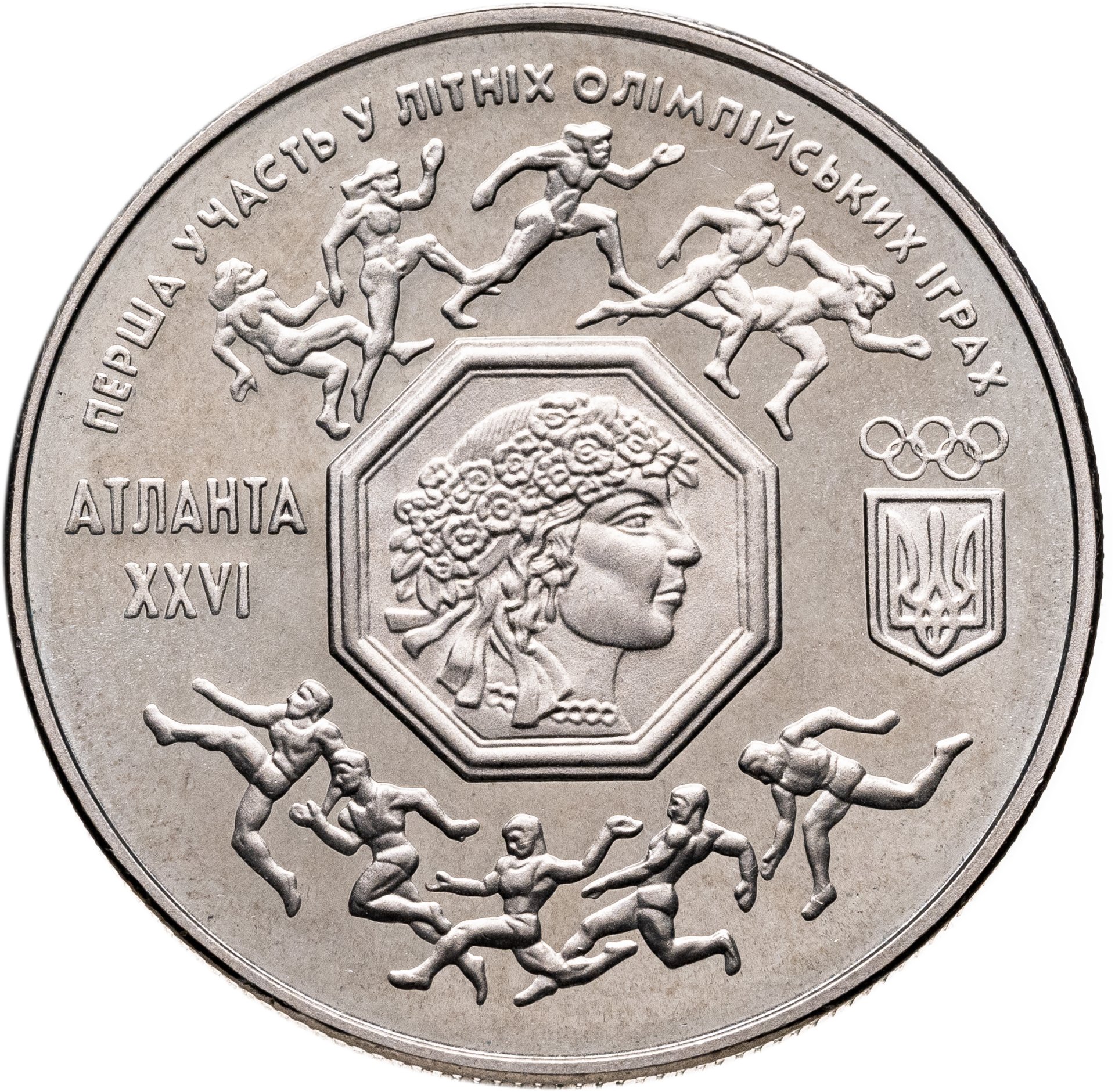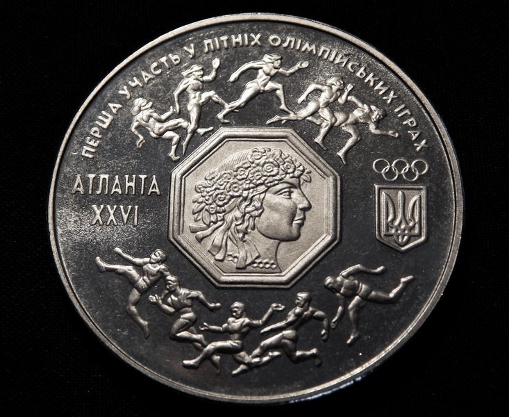 В центре расположено восьмиугольный картуш с изображением профиля молодой женщины в венке с цветами - символический образ Украины, за основу которого взят рисунок из Государственного кредитного билета 1918 года, выполнен Георгием Нарбутом. Над картушем изображены фигуры пяти античных атлетов, под картушем - фигуры пяти современных спортсменов. Справа картуша эмблема Национального олимпийского комитета Украины, слева - надпись в две строки АТЛАНТА XXVI. Вверху по кругу надпись ПЕРВОЕЕ УЧАСТИЕ В ЛЕТНИХ ОЛИМПИЙСКИХ ИГРАХ.