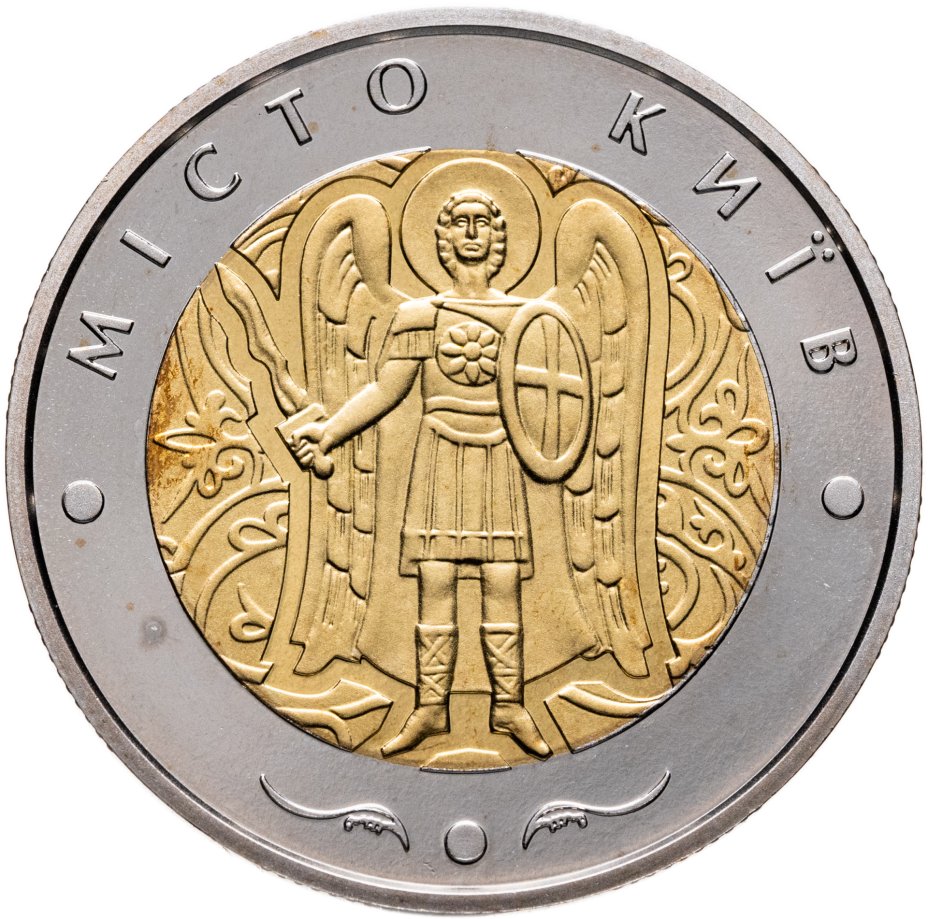 Описание реверса: На кольце надпись «МIСТО КИIВ». Внизу – элемент декоративного узора. В центре, на вставке изображен покровитель Киева и всей Киевской земли, небесный воин, Архангел Михаил.
