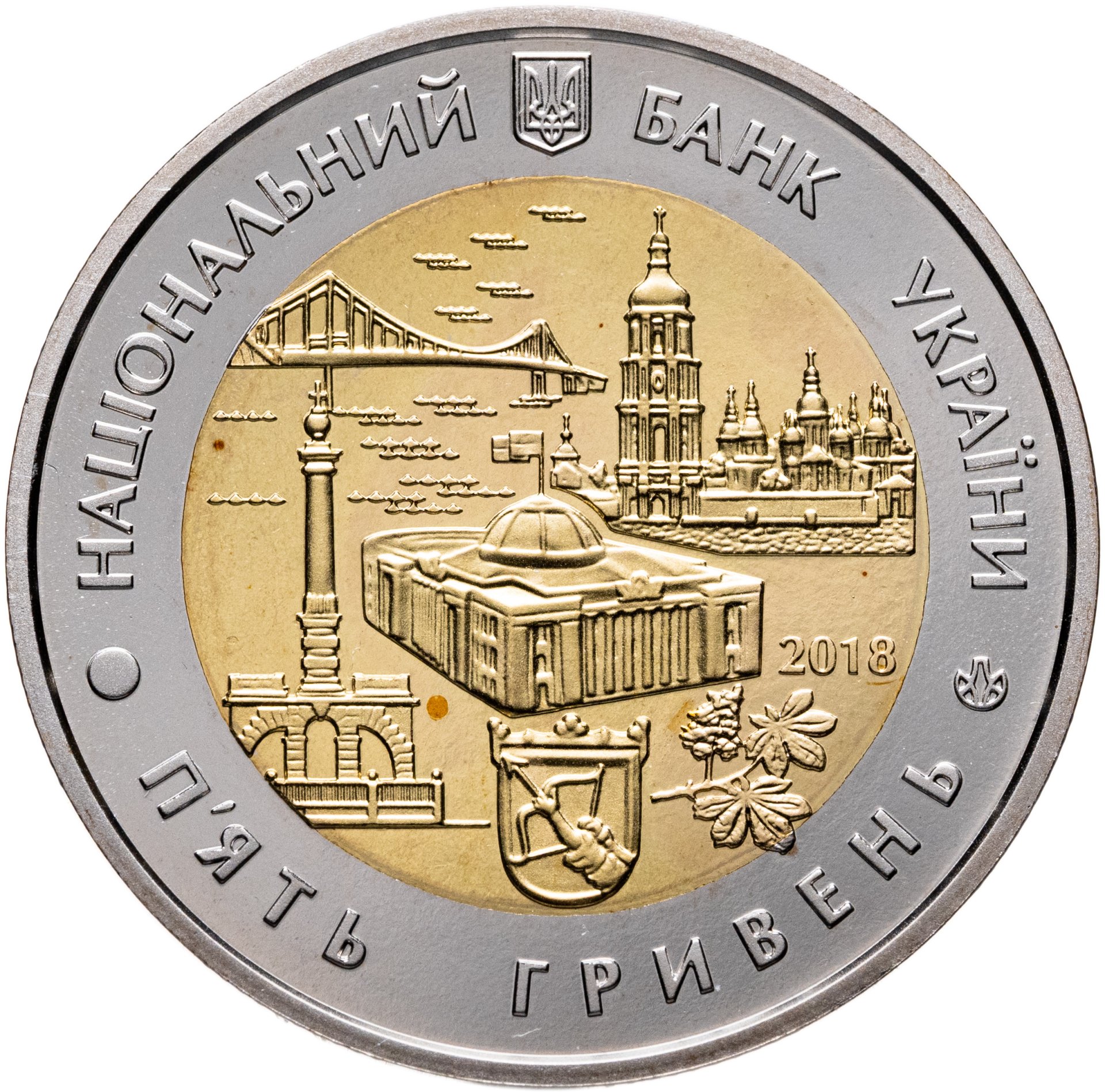 Описание аверса: Вдоль канта, в верхней половине монеты надпись «НАЦIОНАЛЬНИЙ БАНК УКРАIНИ». В нижней половине «П`ЯТЬ ГРИВЕНЬ». Сверху в центре – малый государственный герб Украины «трезубец». Справа сбоку – логотип Банкнотно-монетного двора Национального банка Украины. В центре, на вставке изображены основные достопримечательности Киева: Софийский собор с колокольней, здание Верховной Рады Украины, колонна Магдебургского права, старинный, XV века герб Киева, пешеходный Парковый мост, соединяющий центр города с Тургановским островом, зоной пляжного отдыха на Днепре. И ещё один символ столицы Украины – ветка каштана. Справа от здания Рады отчеканен год выпуска монеты «2018».