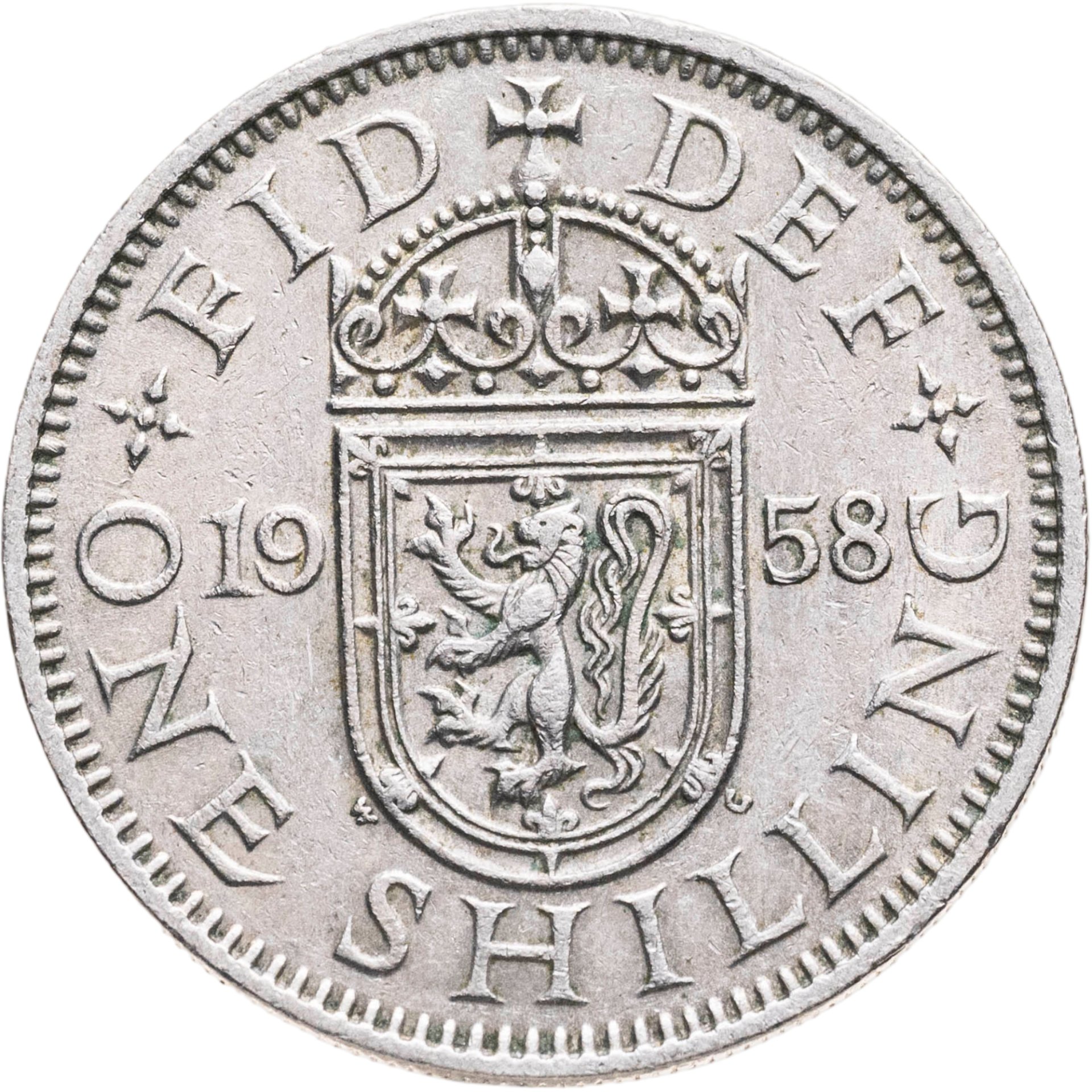 Великобритания 1 шиллинг (shilling) 1958 Шотландский герб - атакующий лев внутри коронованного щита