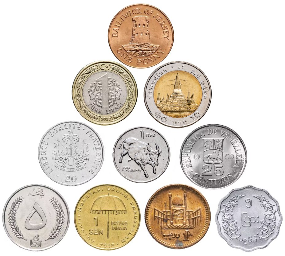 Набор из 10 монет c портретами: Афганистан, Бруней, Венесуэла, Гаити, Джерси, Мьянма, Пакистан, Таиланд, Турция, Филлипины
