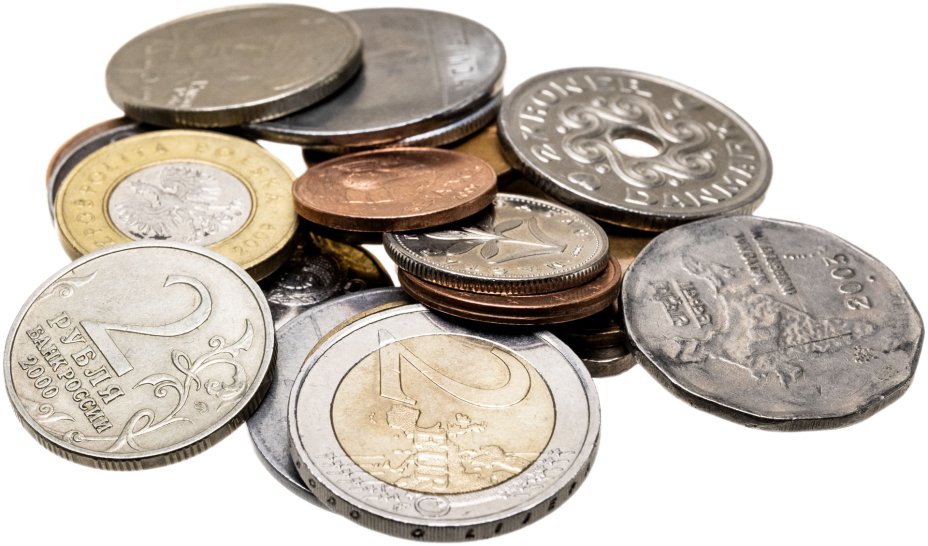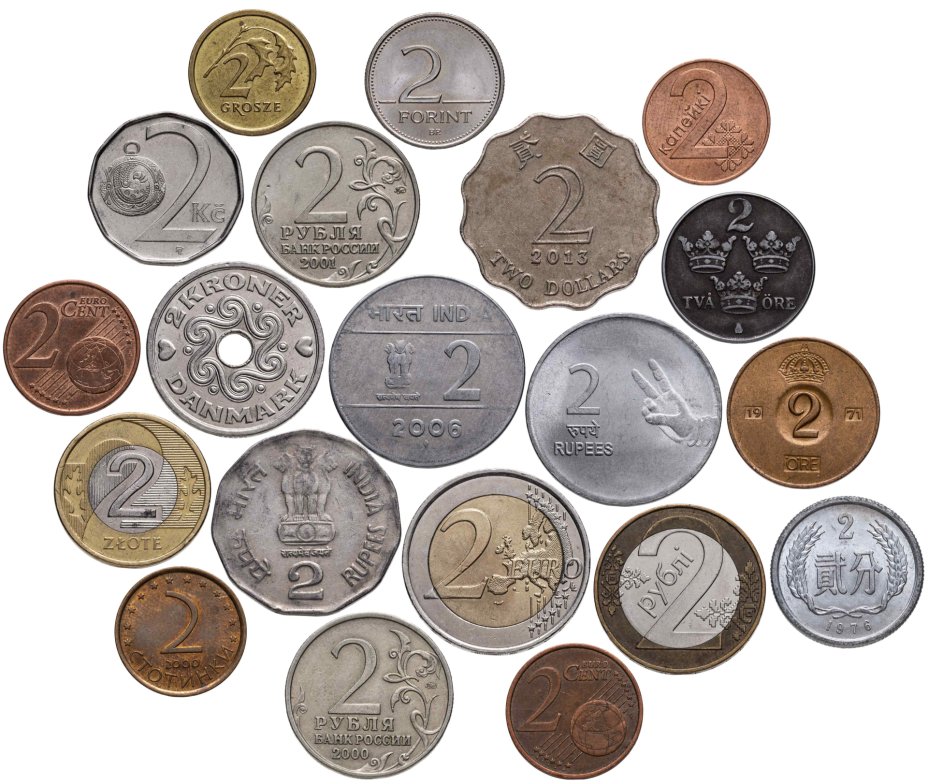 Набор из 20-ти монет разных стран мира "Монеты номиналом 2" в мешочке
