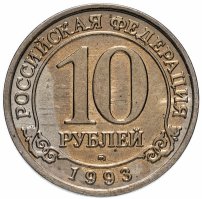 В центре крупно указан номинал - цифра "10". Под номиналом - слово "РУБЛЕЙ". Под словом - буквы "ММД", знак Московского монетного двора. Центральная часть заключена в кольцо, состоящее из линейного ободка и двух сплетённых растительных узоров. За кольцом, на внешней стороне, по кругу вдоль канта надписи: наверху - "РОССИЙСКАЯ ФЕДЕРАЦИЯ", внизу дата выпуска - "1993".