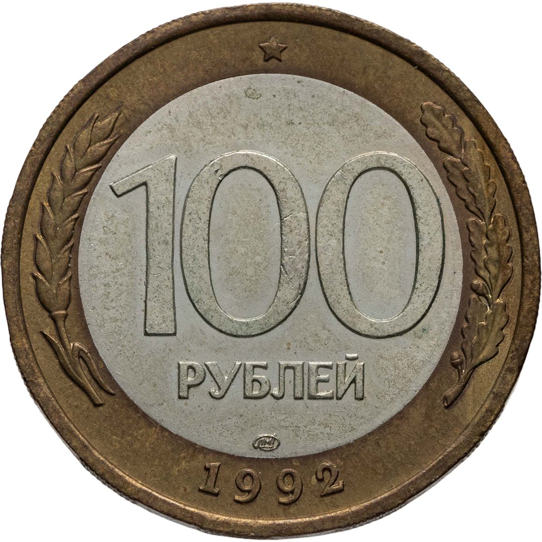Сверху пятиконечная звезда, в центре немного смещенная вверх цифра «100» обозначающая номинал монеты, ниже слово «РУБЛЕЙ», под ним монограмма монетного двора (ЛМД). Внизу у края монеты год выпуска «1992». Слева колос, справа дубовая ветвь.