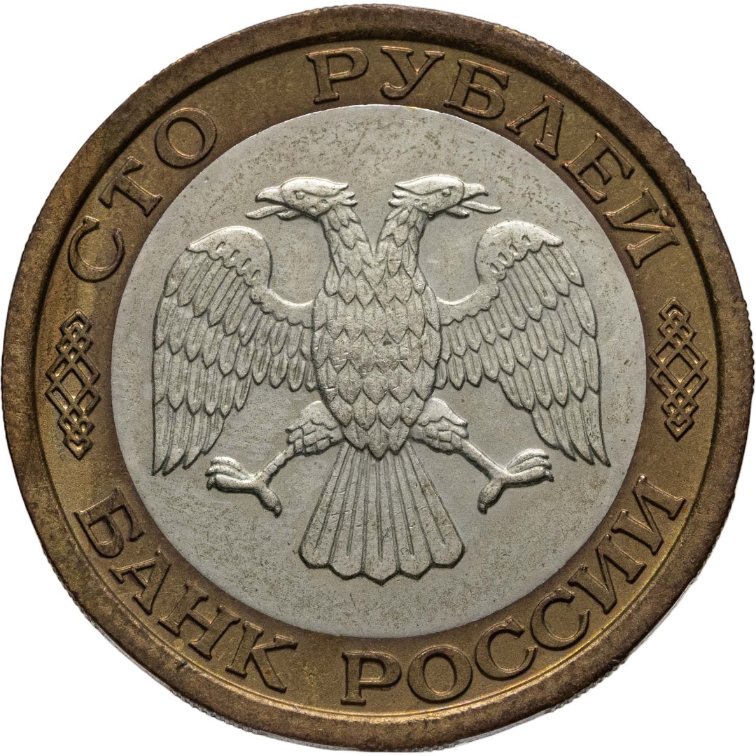 Вверху вдоль канта обозначение достоинства монеты «СТО РУБЛЕЙ» ниже справа и слева орнамент, внизу надпись «БАНК РОССИИ», в середине двуглавый орел с опущенными крыльями, перья с просечками.