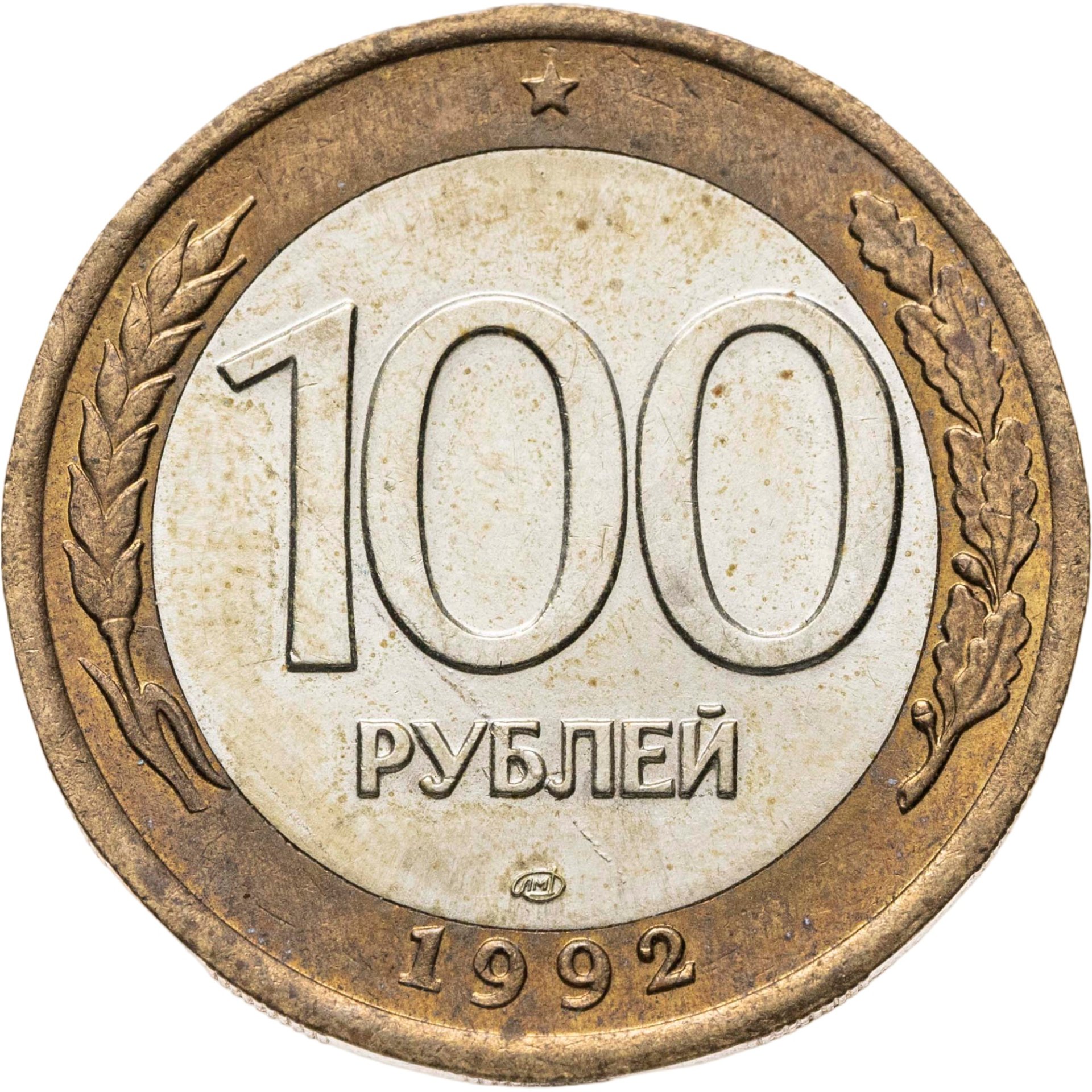 Сверху пятиконечная звезда, в центре немного смещенная вверх цифра «100» обозначающая номинал монеты, ниже слово «РУБЛЕЙ», под ним монограмма монетного двора (ЛМД). Внизу у края монеты год выпуска «1992». Слева колос, справа дубовая ветвь.