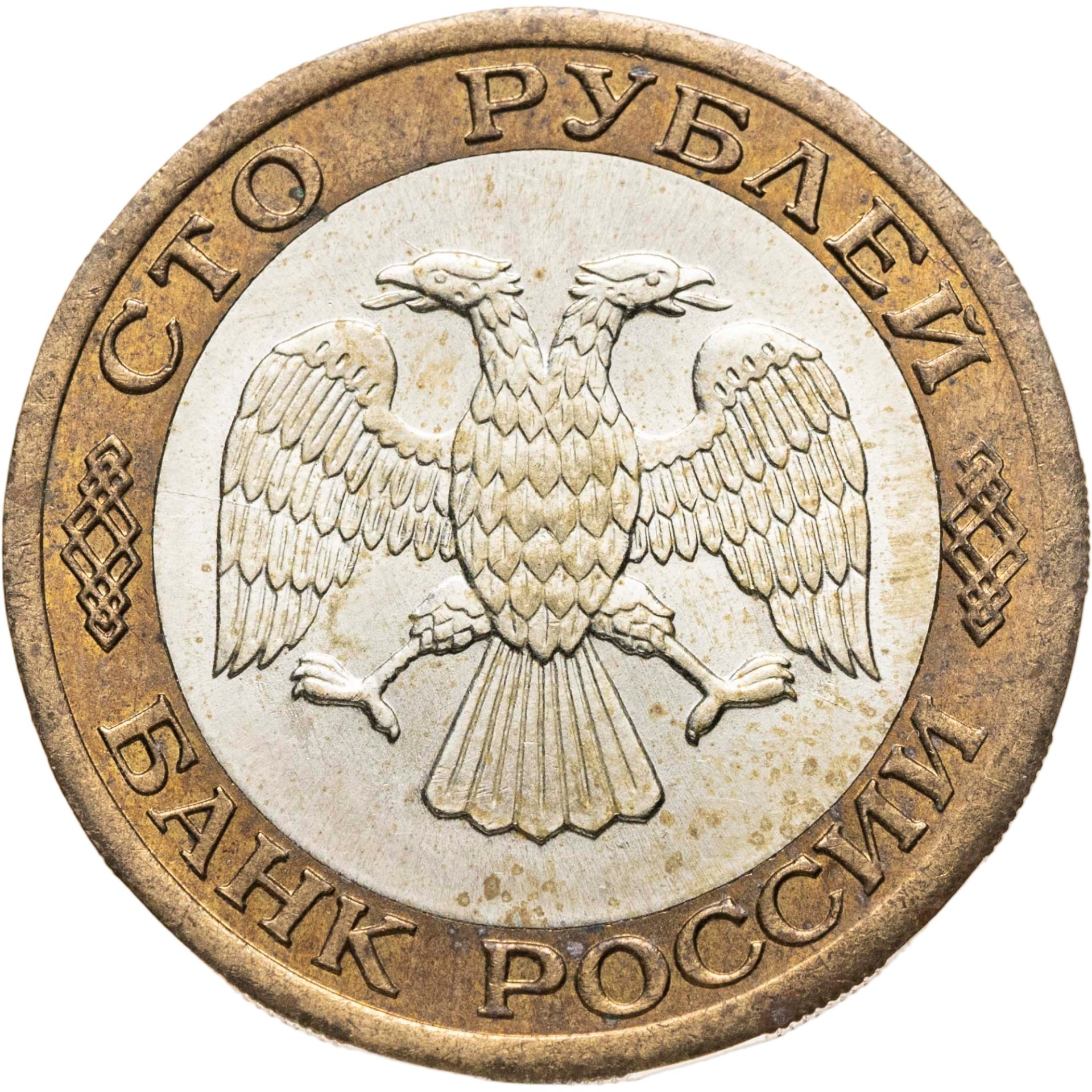 Вверху вдоль канта обозначение достоинства монеты «СТО РУБЛЕЙ» ниже справа и слева орнамент, внизу надпись «БАНК РОССИИ», в середине двуглавый орел с опущенными крыльями, перья с просечками.