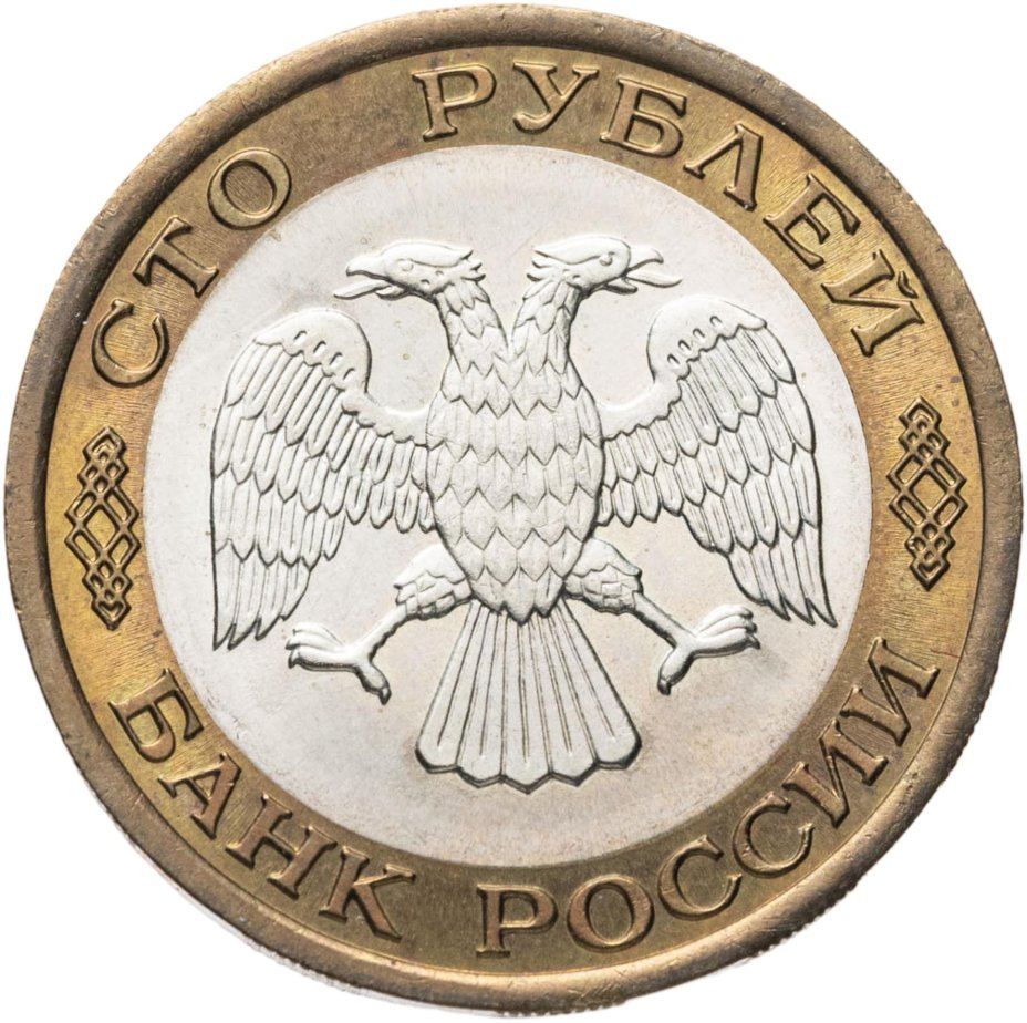 Вверху вдоль канта обозначение достоинства монеты «СТО РУБЛЕЙ» ниже справа и слева орнамент, внизу надпись «БАНК РОССИИ», в середине двуглавый орел с опущенными крыльями, перья с просечками.