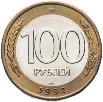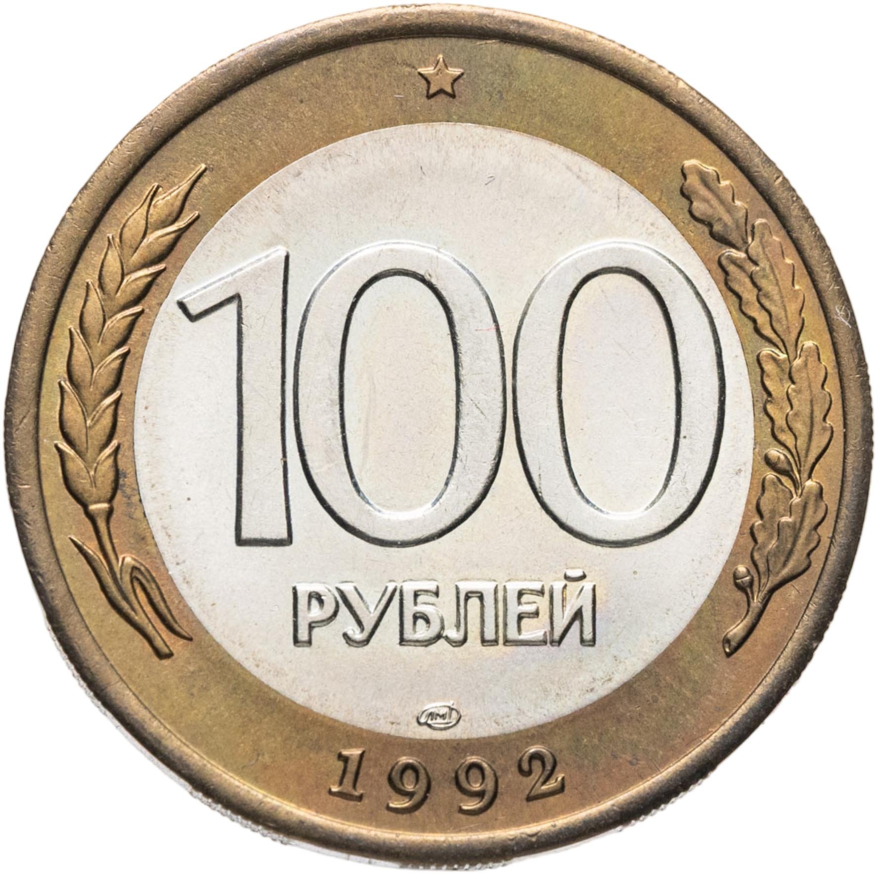 Сверху пятиконечная звезда, в центре немного смещенная вверх цифра «100» обозначающая номинал монеты, ниже слово «РУБЛЕЙ», под ним монограмма монетного двора (ЛМД). Внизу у края монеты год выпуска «1992». Слева колос, справа дубовая ветвь.