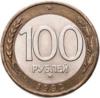 Сверху пятиконечная звезда, в центре немного смещенная вверх цифра «100» обозначающая номинал монеты, ниже слово «РУБЛЕЙ», под ним монограмма монетного двора (ММД). Внизу у края монеты год выпуска «1992». Слева колос, справа дубовая ветвь.