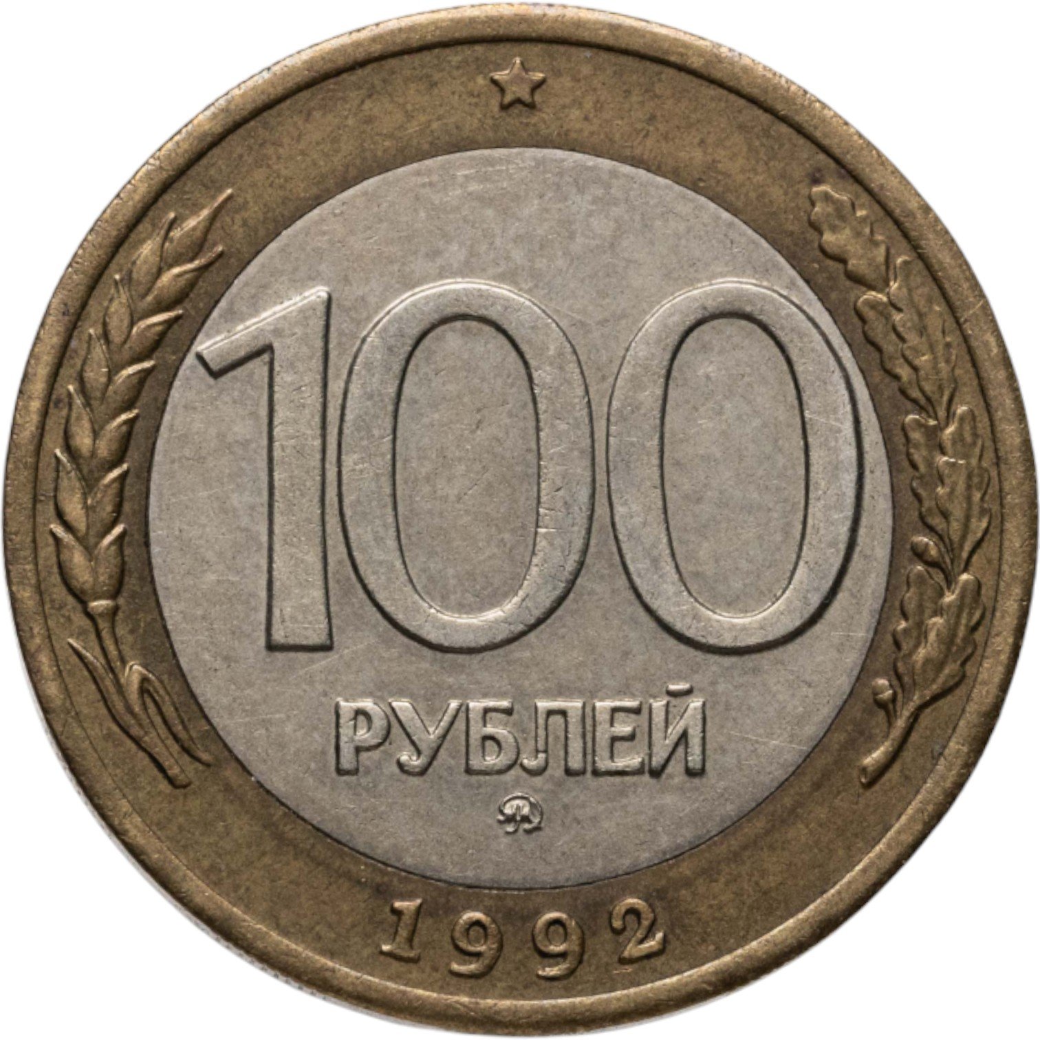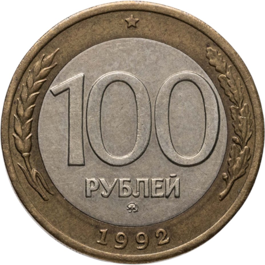 Сверху пятиконечная звезда, в центре немного смещенная вверх цифра «100» обозначающая номинал монеты, ниже слово «РУБЛЕЙ», под ним монограмма монетного двора (ММД). Внизу у края монеты год выпуска «1992». Слева колос, справа дубовая ветвь.