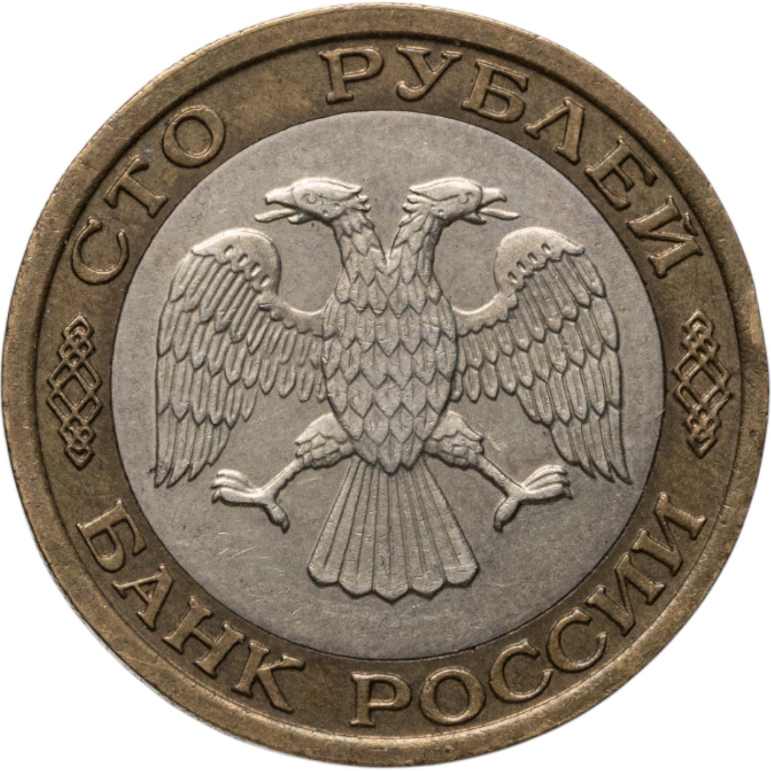 Вверху вдоль канта обозначение достоинства монеты «СТО РУБЛЕЙ» ниже справа и слева орнамент, внизу надпись «БАНК РОССИИ», в середине двуглавый орел с опущенными крыльями, перья без просечек.