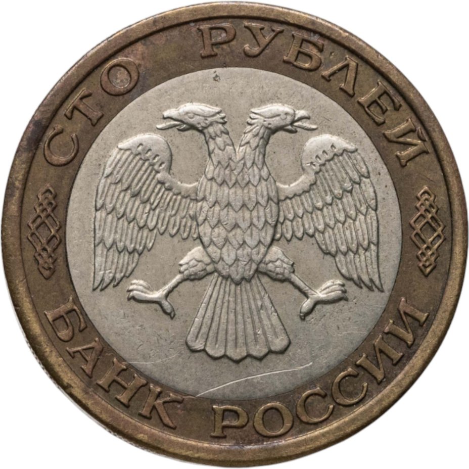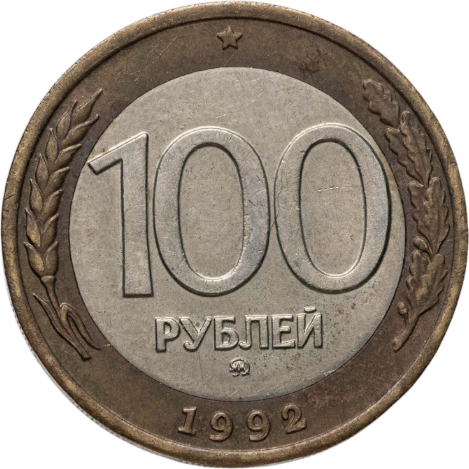Сверху пятиконечная звезда, в центре немного смещенная вверх цифра «100» обозначающая номинал монеты, ниже слово «РУБЛЕЙ», под ним монограмма монетного двора (ММД). Внизу у края монеты год выпуска «1992». Слева колос, справа дубовая ветвь.
