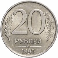 В центре немного смещенная вверх цифра «20» обозначающая номинал монеты, ниже слово «РУБЛЕЙ», под ним монограмма монетного двора (ММД). Внизу у края монеты год выпуска «1993». Слева колос, справа дубовая ветвь.