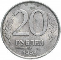 В центре немного смещенная вверх цифра «20» обозначающая номинал монеты, ниже слово «РУБЛЕЙ», под ним монограмма монетного двора (ММД). Внизу у края монеты год выпуска «1993». Слева колос, справа дубовая ветвь.
