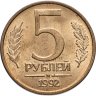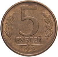 По причине бешеной инфляции в начале 1990-х годов 5 рублей 1992 г. очень быстро вышли из обращения, а в ход пошли более крупные номиналы. Различаются 5 рублевые монеты по логотипам монетных дворов: «М», «Л» и более редкие «ММД». Монета переходного периода. Россия стремилась из социализма в капитализм, и неразбериха была везде. В том числе и в государственных символах.