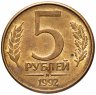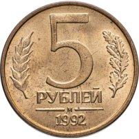 По причине бешеной инфляции в начале 1990-х годов 5 рублей 1992 г. очень быстро вышли из обращения, а в ход пошли более крупные номиналы. Различаются 5 рублевые монеты по логотипам монетных дворов: «М», «Л» и более редкие «ММД». Монета переходного периода. Россия стремилась из социализма в капитализм, и неразбериха была везде. В том числе и в государственных символах.