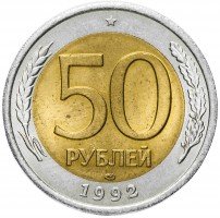 Сверху пятиконечная звезда, в центре немного смещенная вверх цифра «50» обозначающая номинал монеты, ниже слово «РУБЛЕЙ», под ним монограмма монетного двора (ЛМД). Внизу у края монеты год выпуска «1992». Слева колос, справа дубовая ветвь.