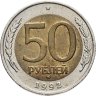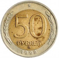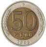 Сверху пятиконечная звезда, в центре немного смещенная вверх цифра «50» обозначающая номинал монеты, ниже слово «РУБЛЕЙ», под ним монограмма монетного двора (ММД). Внизу у края монеты год выпуска «1992». Слева колос, справа дубовая ветвь.