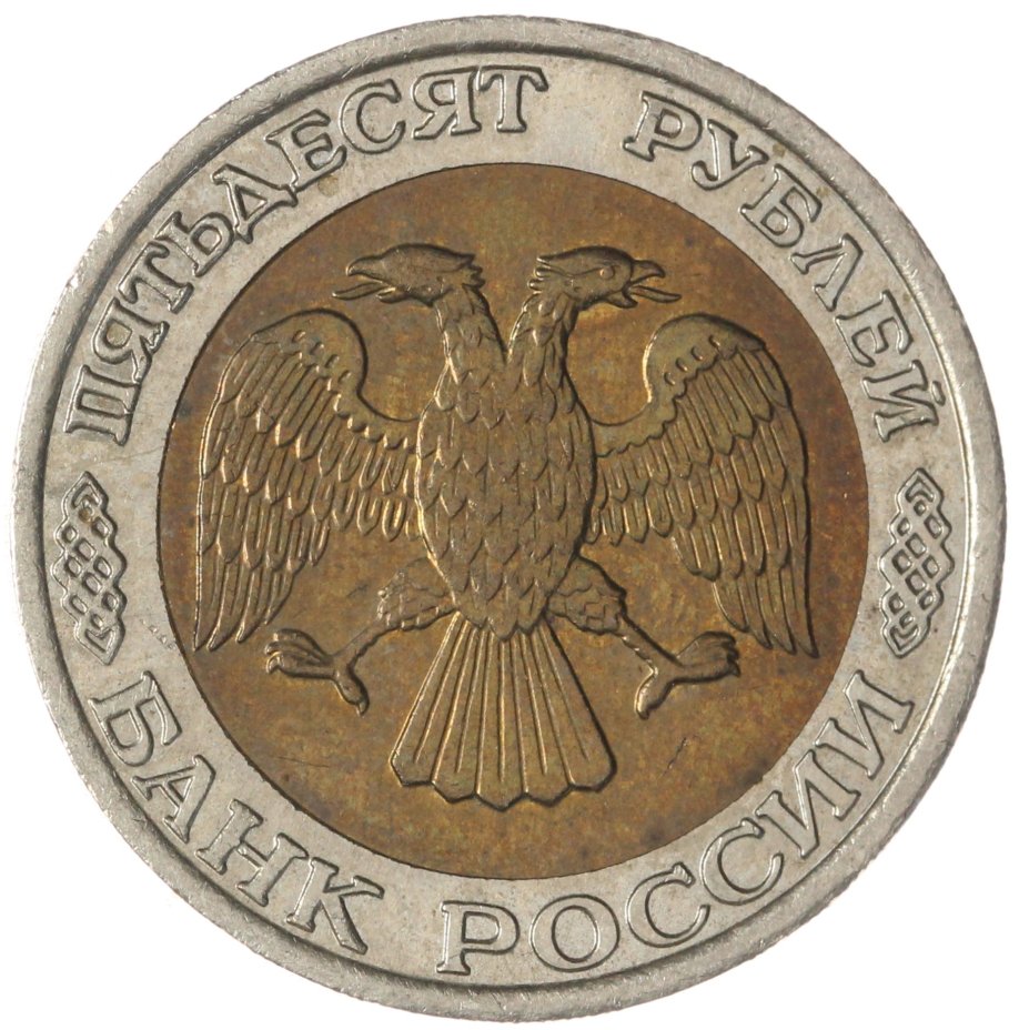 Вверху вдоль канта обозначение достоинства монеты «ПЯТЬДЕСЯТ РУБЛЕЙ» ниже справа и слева орнамент, внизу надпись «БАНК РОССИИ», в середине двуглавый орел с опущенными крыльями, перья без просечек.