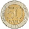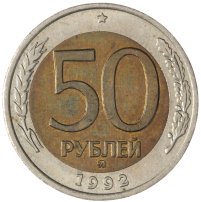 Сверху пятиконечная звезда, в центре немного смещенная вверх цифра «50» обозначающая номинал монеты, ниже слово «РУБЛЕЙ», под ним монограмма монетного двора (ММД). Внизу у края монеты год выпуска «1992». Слева колос, справа дубовая ветвь.