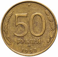 В 1993 году инфляция широко шагала по России и другим независимым государствам, бывшим республикам СССР. 50 рублей стали мелкой разменной монетой, примерно как 5 копеек в СССР. Этот номинал чеканили оба монетных двора из латуни. Монеты немагнитные. Московские монеты разновидностей не имеют. 50 рублей ЛМД делятся на две разновидности: у орла два пера отчеканены с просечками и вариант штемпеля без просечек. Любая такая разновидность не является нумизматической редкостью, но в коллекции хорошо будут смотреться все три монеты.