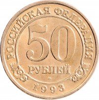 В центре крупно указан номинал - цифра "50". Под номиналом - слово "РУБЛЕЙ". Под словом - буквы "ММД", знак Московского монетного двора. Центральная часть заключена в кольцо, состоящее из линейного ободка и двух сплетённых растительных узоров. За кольцом, на внешней стороне, по кругу вдоль канта надписи: наверху - "РОССИЙСКАЯ ФЕДЕРАЦИЯ", внизу дата выпуска - "1993".