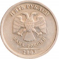 Сверху вдоль выступающего канта указано достоинство монеты «ПЯТЬ РУБЛЕЙ». В середине монеты двуглавый орел и ниже расположенные полукругом слова «БАНК РОССИИ». Под левой ногой орла монограмма монетного двора «СПМД». Внизу у края монеты год выпуска «2003», над ним две горизонтальные заостренные черты смотрящие в разные стороны, между ними точка.