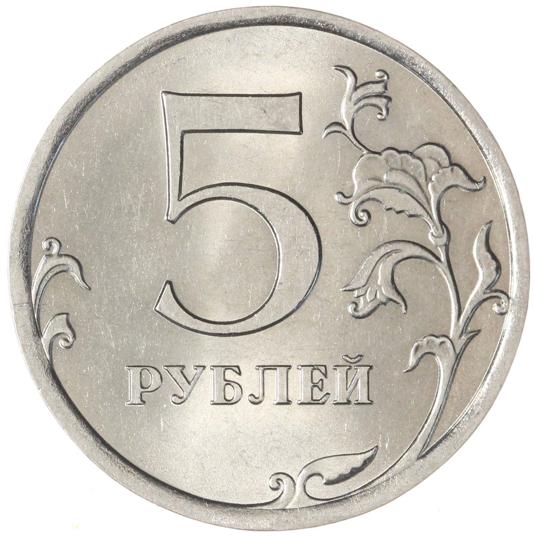 В середине немного смещенная влево и вверх цифра «5», обозначающая достоинство монеты, ниже надпись «РУБЛЕЙ», в нижней части поля, слева и справа завитки растительного орнамента.