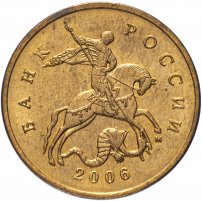 Слева вдоль выступающего канта слово «БАНК», справа «РОССИИ», внизу год выпуска «2006», в центре Георгий Победоносец колющий копьем змея, под передней ногой коня буквенное обозначение монетного двора «М» (ММД).