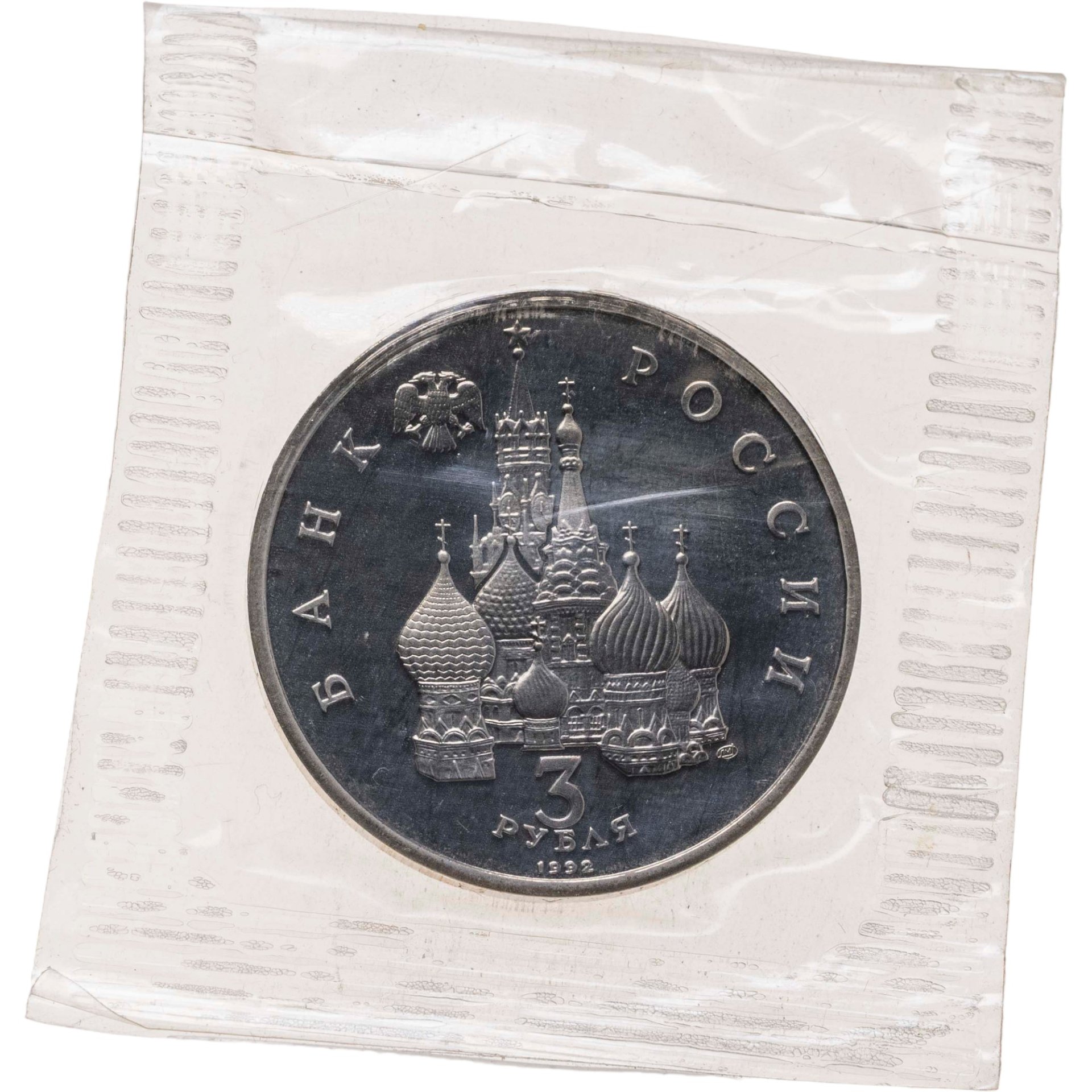 Сверху влево небольшое изображение двухглавого орла, слева слово «БАНК», справа «РОССИИ», внизу обозначение достоинства монеты - цифра «3» под ним слово «рубля», ниже год выпуска монеты «1992», в середине Собор Покрова Пресвятой Богородицы (собор Василия Блаженного) и за ним Спасская башня Московского Кремлля, чуть ниже и правее монограмма монетного двора «ЛМД».