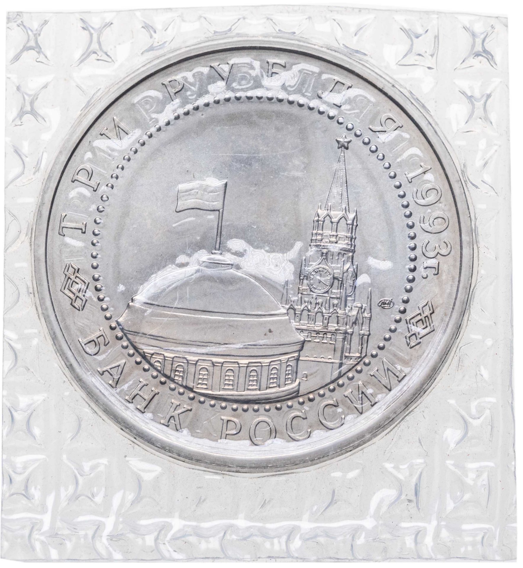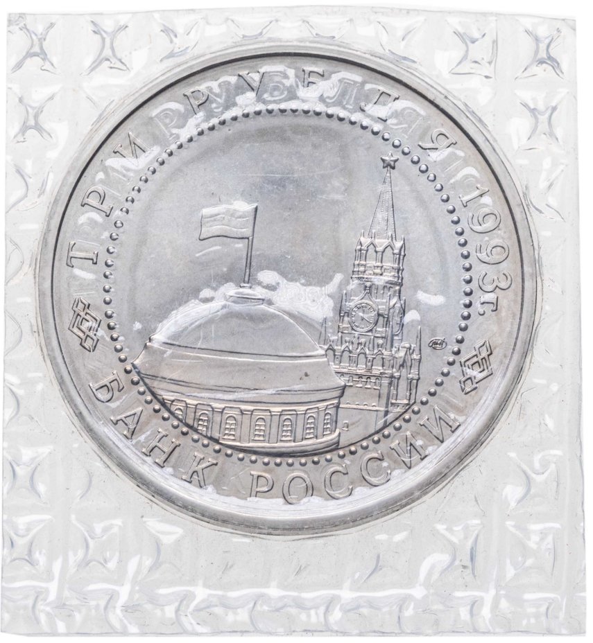 Вверху вдоль канта номинал «ТРИ РУБЛЯ» и год выпуска «1993 г.», внизу слова «БАНК РОССИИ». В середине в ободке из точек изображение Спасской башни Московского Кремля и частично перекрывающего ее купола Сенатского дворца с развевающимся флагом, с внутренней стороны точечного ободка справа монограмма монетного двора «ЛМД».