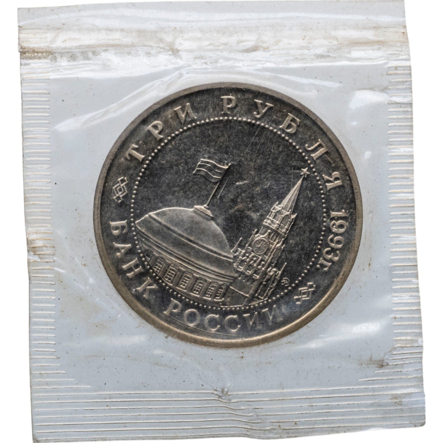 Вверху вдоль канта номинал «ТРИ РУБЛЯ» и год выпуска «1993 г.», внизу слова «БАНК РОССИИ». В середине в ободке из точек изображение Спасской башни Московского Кремля и частично перекрывающего ее купола Сенатского дворца с развевающимся флагом, с внутренней стороны точечного ободка справа монограмма монетного двора «ММД».