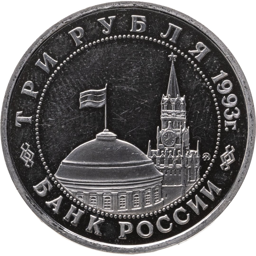 Вверху вдоль канта номинал «ТРИ РУБЛЯ» и год выпуска «1993 г.», внизу слова «БАНК РОССИИ». В середине в ободке из точек изображение Спасской башни Московского Кремля и частично перекрывающего ее купола Сенатского дворца с развевающимся флагом, с внутренней стороны точечного ободка справа монограмма монетного двора «ММД».