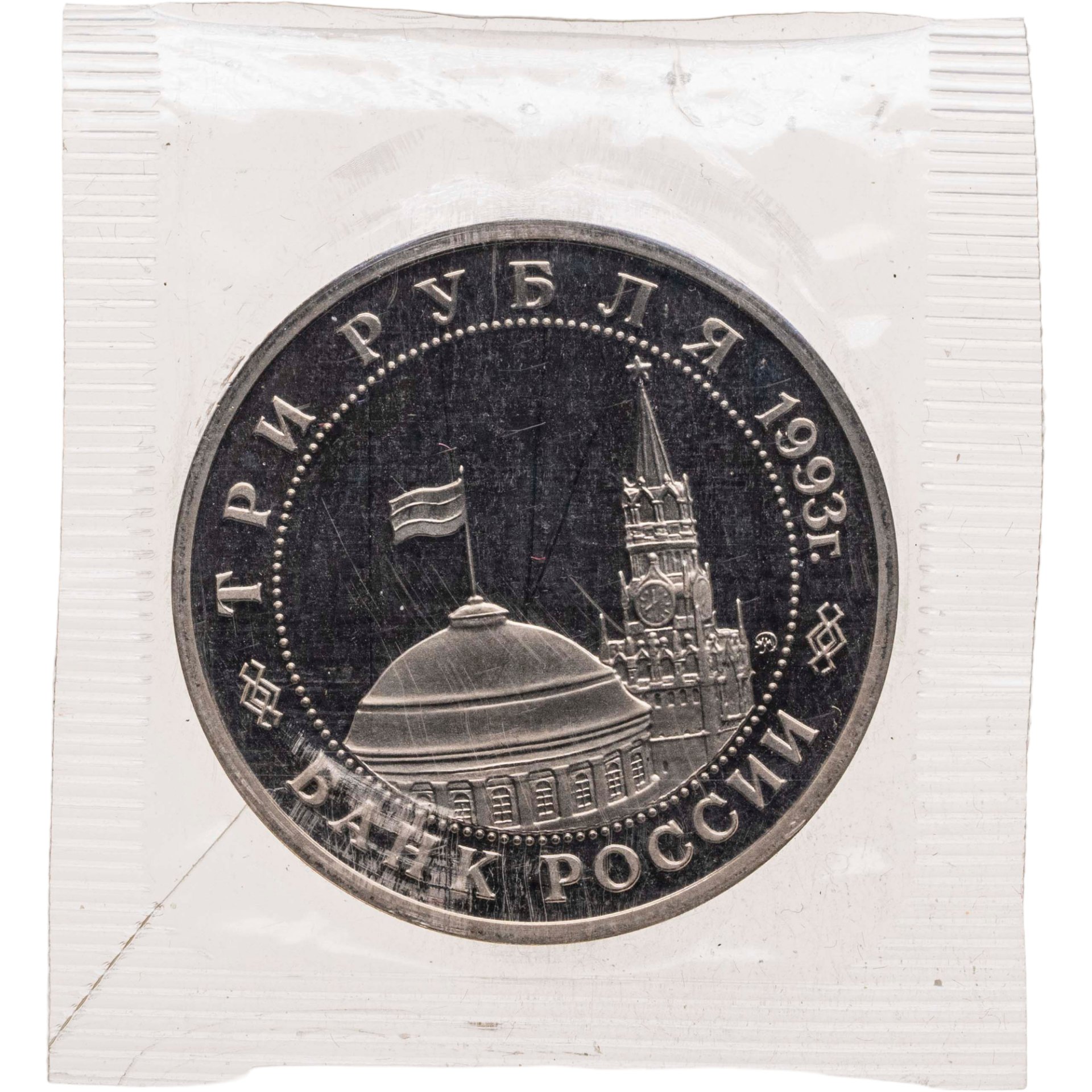 Вверху вдоль канта номинал «ТРИ РУБЛЯ» и год выпуска «1993 г.», внизу слова «БАНК РОССИИ». В середине в ободке из точек изображение Спасской башни Московского Кремля и частично перекрывающего ее купола Сенатского дворца с развевающимся флагом, с внутренней стороны точечного ободка справа монограмма монетного двора «ММД».