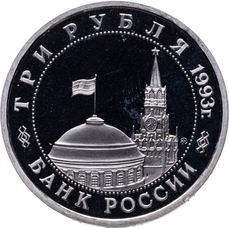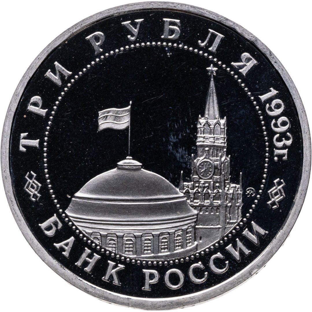 Вверху вдоль канта номинал «ТРИ РУБЛЯ» и год выпуска «1993 г.», внизу слова «БАНК РОССИИ». В середине в ободке из точек изображение Спасской башни Московского Кремля и частично перекрывающего ее купола Сенатского дворца с развевающимся флагом, с внутренней стороны точечного ободка справа монограмма монетного двора «ММД».