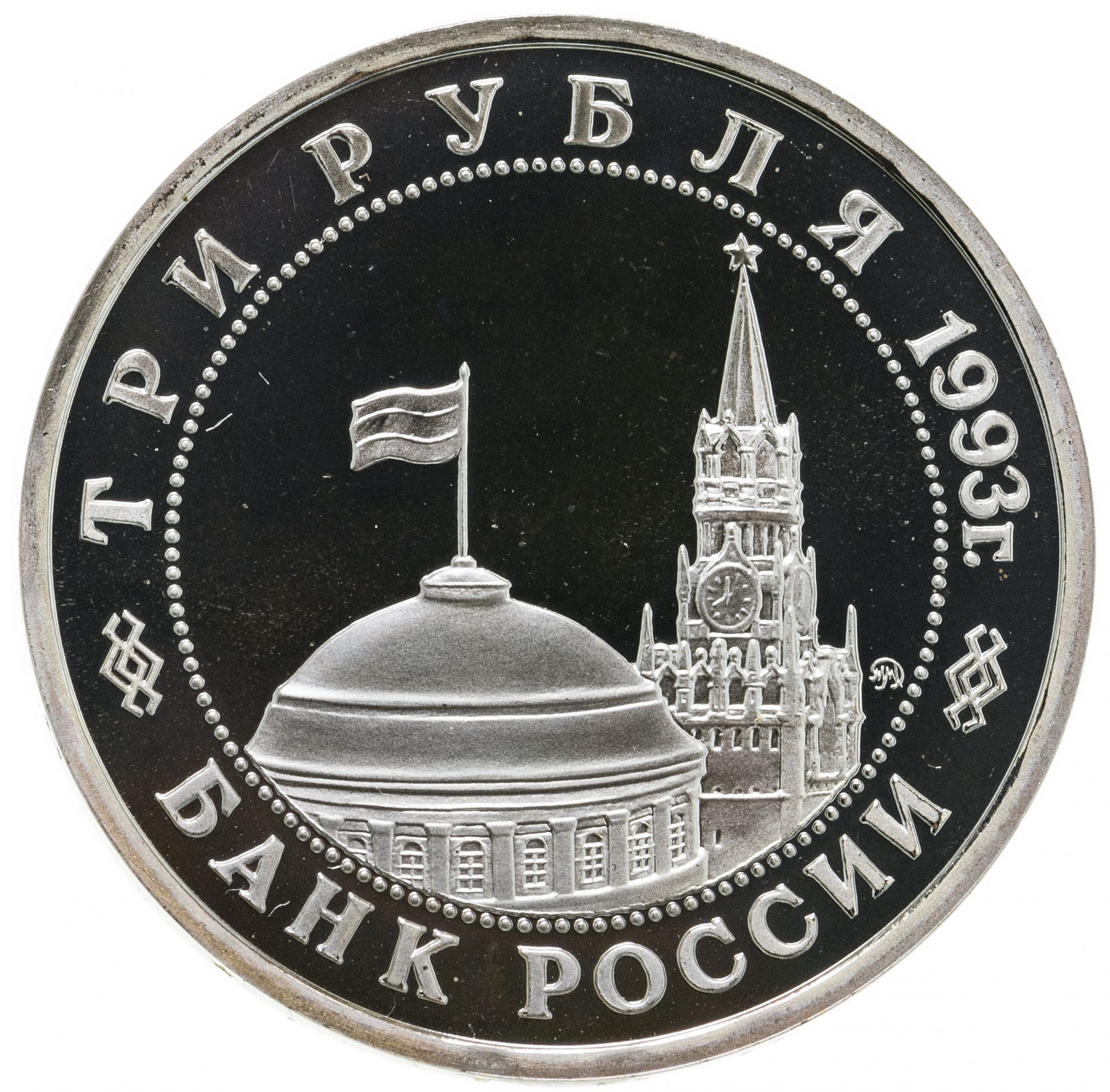 Вверху вдоль канта номинал «ТРИ РУБЛЯ» и год выпуска «1993 г.», внизу слова «БАНК РОССИИ». В середине в ободке из точек изображение Спасской башни Московского Кремля и частично перекрывающего ее купола Сенатского дворца с развевающимся флагом, с внутренней стороны точечного ободка справа монограмма монетного двора «ММД».