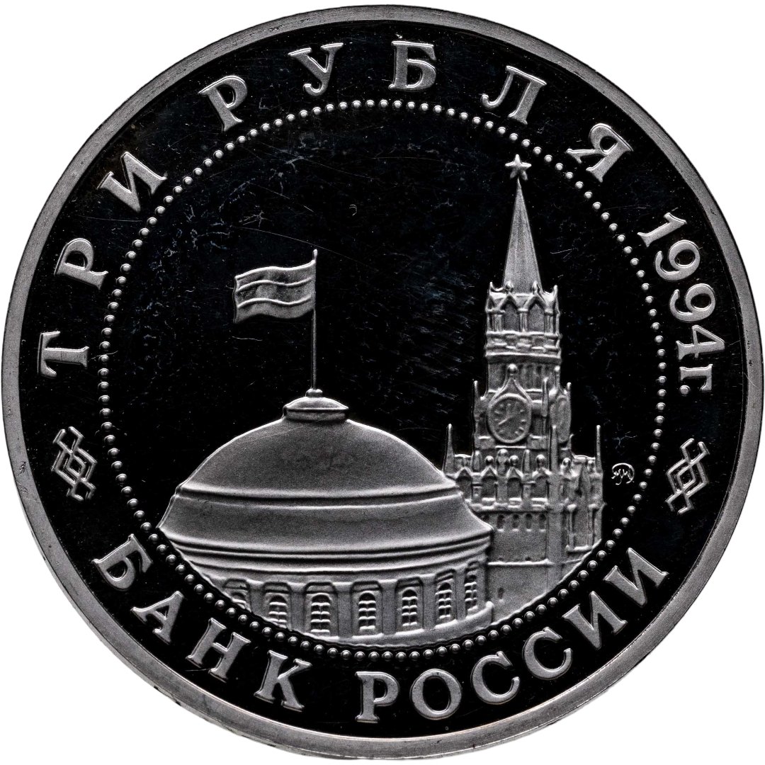 Вверху вдоль канта номинал «ТРИ РУБЛЯ» и год выпуска «1994 г.», внизу слова «БАНК РОССИИ». В середине в ободке из точек изображение Спасской башни Московского Кремля и частично перекрывающего ее купола Сенатского дворца с развевающимся флагом, с внутренней стороны точечного ободка справа монограмма монетного двора «ММД».