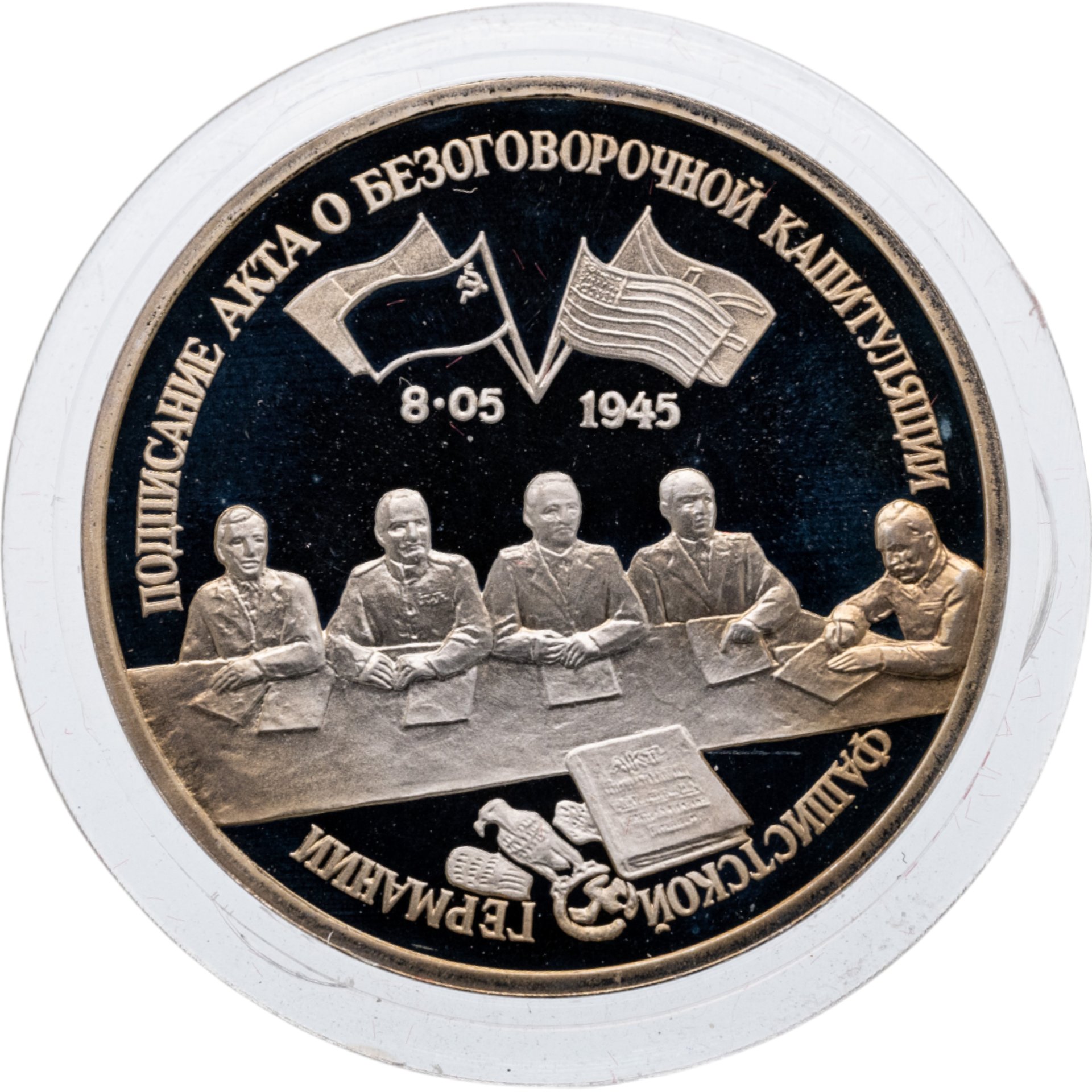 Изображение представителей Верховного командования союзных войск: сидящих за столом в момент подписания Акта о безоговорочной капитуляции фашистской Германии, над ними - государственные флаги: слева - Франции и ССССР, справа - США и Великобритании, под флагами - дата "8.05.1945". По окружности надписи: вверху - "ПОДПИСАНИЕ АКТА О БЕЗОГОВОРОЧНОЙ КАПИТУЛЯЦИИ", внизу -"ФАШИСТСКОЙ ГЕРМАНИИ".На боковой поверхности монеты - две углублённые надписи "ТРИ РУБЛЯ", разделённые двумя звёздочками.
