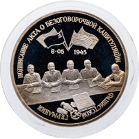 • Название монеты: освобождение Европы от фашизма. Подписание Акта о безоговорочной капитуляции фашистской Германии