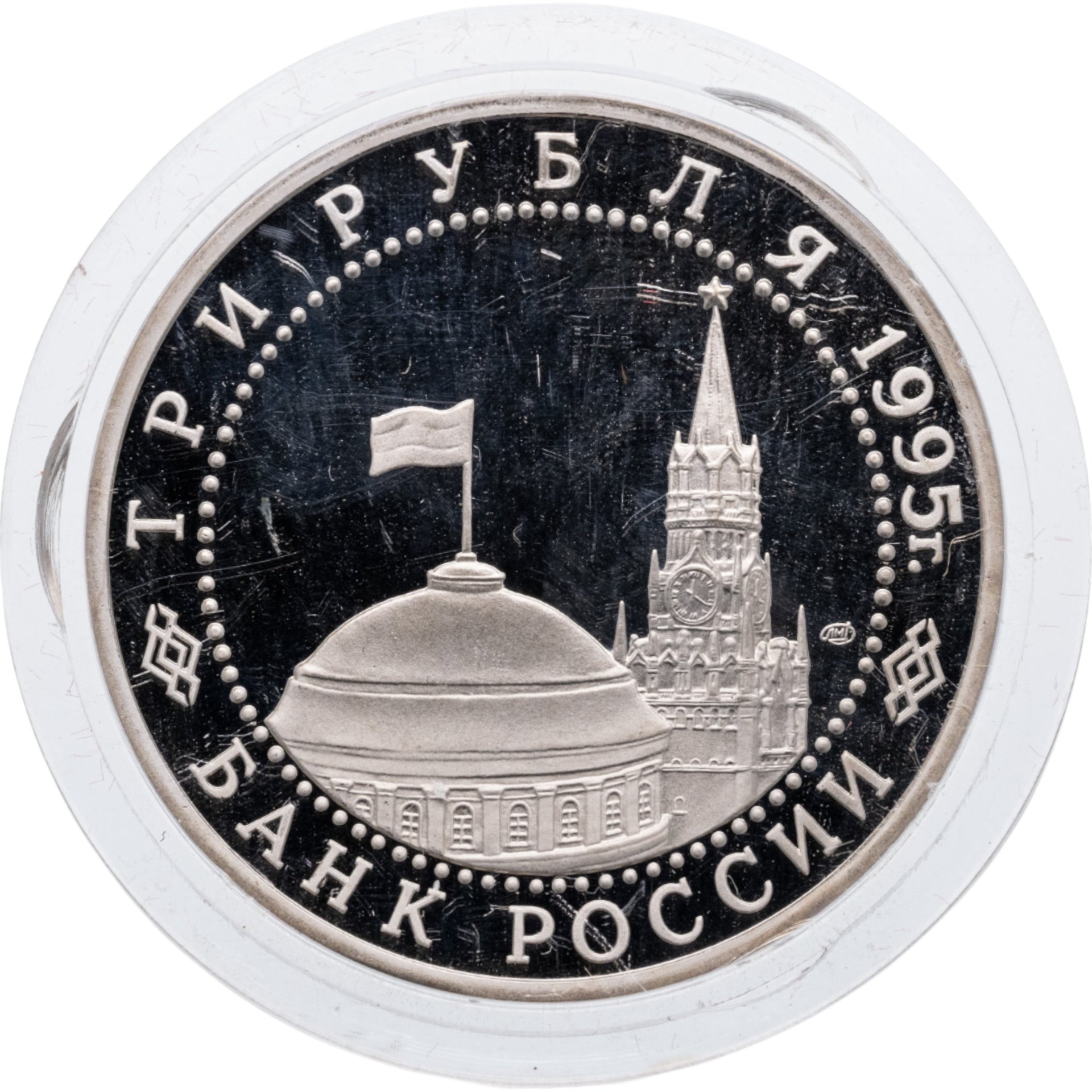 Вверху вдоль канта номинал «ТРИ РУБЛЯ» и год выпуска «1995 г.», внизу слова «БАНК РОССИИ». В середине в ободке из точек изображение Спасской башни Московского Кремля и частично перекрывающего ее купола Сенатского дворца с развевающимся флагом, с внутренней стороны точечного ободка справа монограмма монетного двора «ЛМД».