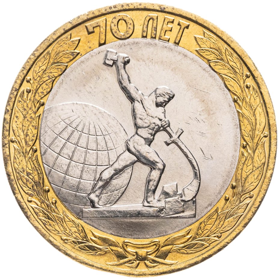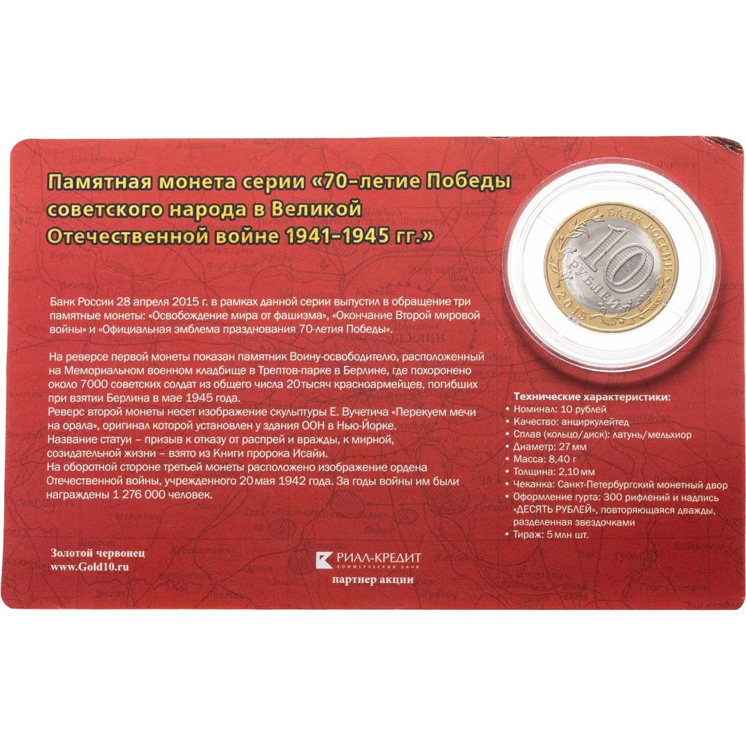Монета "Освобождение мира от фашизма" на реверсе имеет изображение памятника, который возведён в честь воина-освободителя и находится в германской столице. 12-метровая скульптура - напоминание о свержении врага - появилась ровно через четыре года после победы, 8 мая 1949. Немецкие и советские мотивы здесь сплетаются, показывая отношение сторон. Советский воин с мечом стоит на обломках свастики - в древние времена символа солнца, а при ВОВ - символа ужаса. Меч солдата опущен. Во второй руке он поддерживает немецкую девочку.