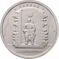 Памятная монета из стали была отчеканена на Московском монетном дворе тиражом 2 млн. экземпляров в августе 2016 года. На реверсе изображен фрагмент памятника советскому воину – освободителю Таллина. В центре – фигура солдата на фоне кирпичной обрывающейся стены, над ним – Орден Великой Отечественной войны. Советский воин изображен с опущенной в знак скорби головой, держащим в левой руке военную каску. На заднем плане – в силуэтном изображении Старого города Таллина слева угадывается одна из крепостных башен, а справа – церковь святого Олафа. Вверху реверса дугообразная надпись «Таллин», обрамленная двумя звездами, внизу – дата памятного события – «22 сентября 1944 г.».