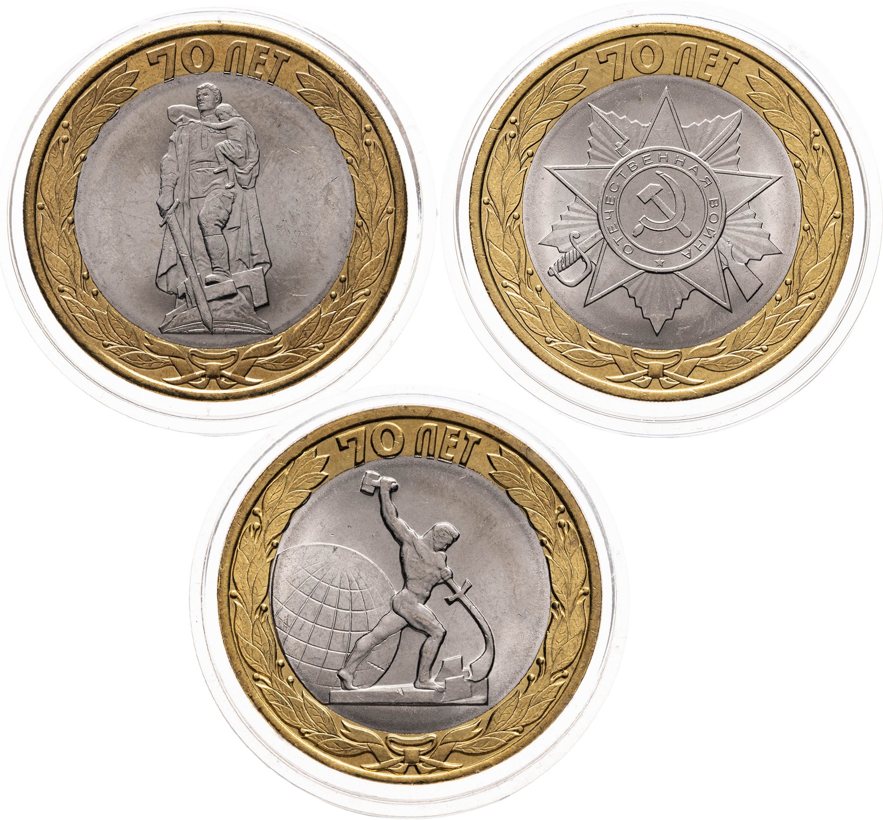 Набор из трех монет 10 рублей 2015 СПМД 70 лет Победы в Великой Отечественной войне