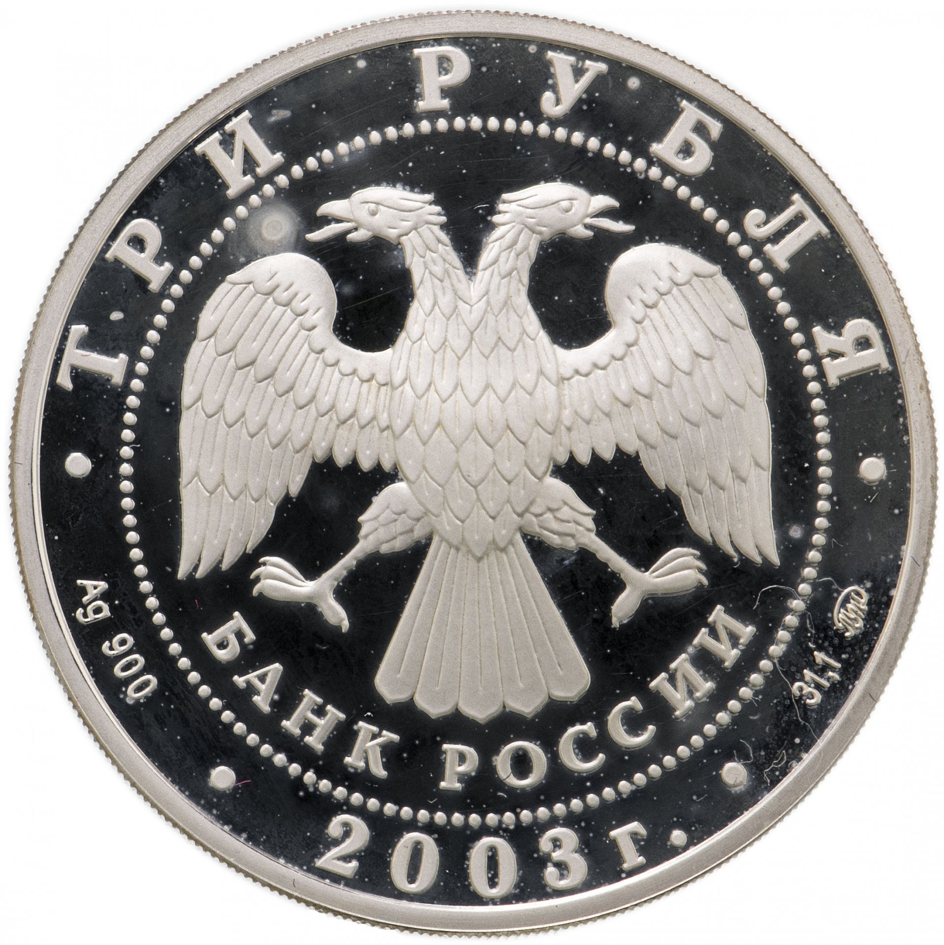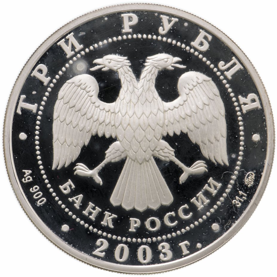 Вверху вдоль канта номинал «ТРИ РУБЛЯ», внизу слева химическое название «Ag» и проба «900» металла, внизу по центру год выпуска «2003 г.», внизу справа чистый вес находящегося в монете драгоценного металла «31,10» и монограмма монетного двора «ММД». В середине в ободке из точек двуглавый орел под ним с внутренней стороны точечного ободка слова «БАНК РОССИИ».
