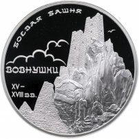 Cправа - архитектурный комплекс башен на скалах, слева на фоне облаков надписи, внизу: "ВОВНУШКИ" и даты в две строки "XV-XVIII вв.", вверху по окружности "БОЕВАЯ БАШНЯ".