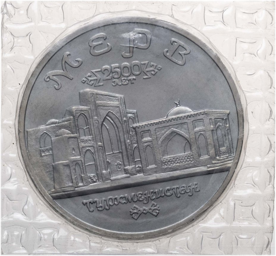Изображение архитектурных памятников древнего Мерва, вверху по окружности - надпись: "МЕРВ", ниже - окаймлённая узором дата в две строки: "2500 ЛЕТ", внизу - надпись: "ТУРКМЕНИСТАН" и элемент узора.