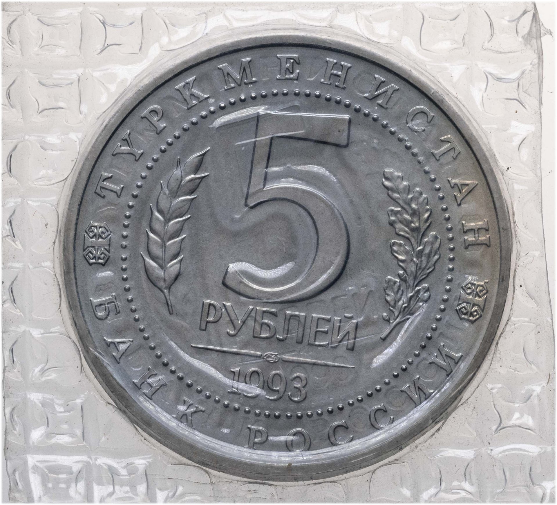 В центре диска - надпись в две строки: "5 РУБЛЕЙ", - слева и справа от неё - лавровая и дубовая ветви, под словом "РУБЛЕЙ", в центре прерывистой линии - товарный знак монетного двора, ниже - дата: "1993". По окружности надписи, обрамлённые кругом из точек: вверху - "ТУРКМЕНИСТАН", внизу - "БАНК РОССИИ".